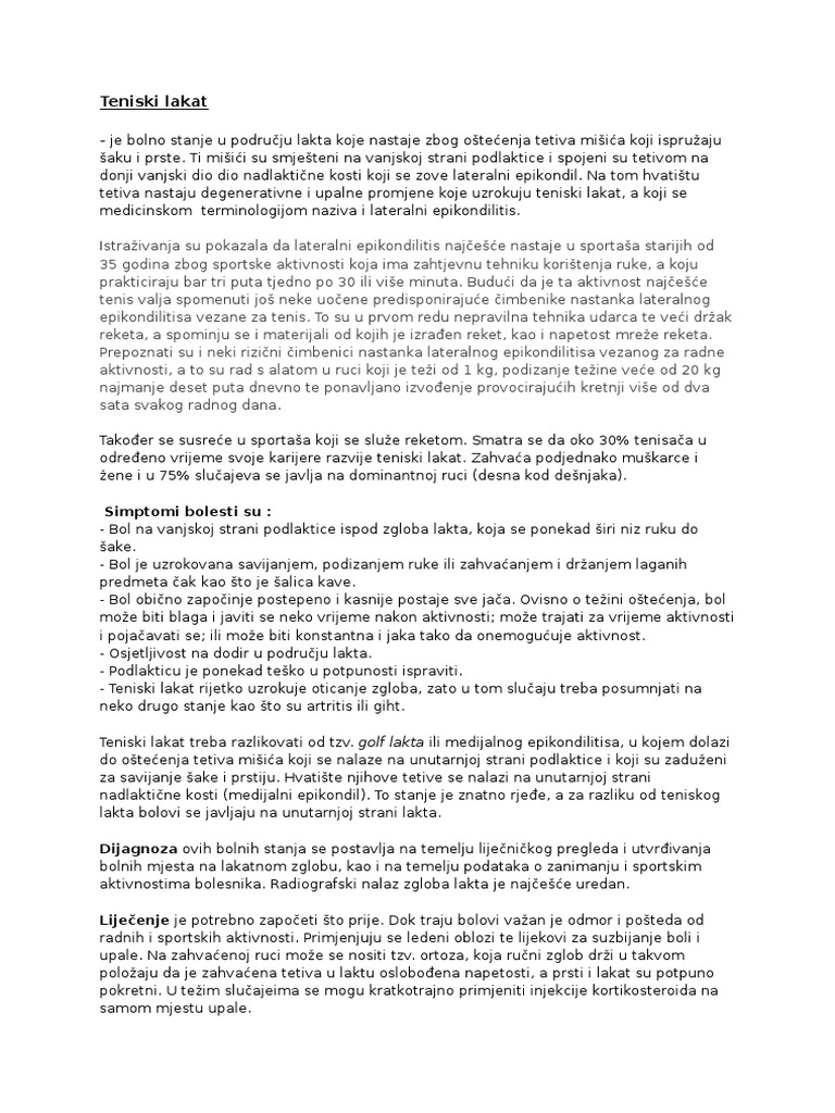 Teniski Lakat - Teniski Lakat Abeceda Zdravlja : Danas gotovo polovica svih igrača tenisa oboli od ove bolesti, no oni čine manje od 5 posto oboljelih od ove upale, pa uvriježeni naziv ove bolesti, teniski lakat, ne daje pravu sliku stvari, lako osobe svih godina i.. Ime bolesti „teniski lakat koristi se od kraja 19. Dijagnoza ovih bolnih stanja se postavlja na osnovu lekarskog pregleda i utvrđivanja bolnih mesta na zglobu lakta, kao i na osnovu podataka o zanimanju i sportskim aktivnostima bolesnika. U okolini lakta hvata se većina mišića koja pokreće prste i omogućuje njihov stisak i opuštanje, što zapravo znači da se sve uhvatimo, podignemo ili nosimo u rukama, prenosi od šake preko lakta, pa sve do ramena. Teniski lakat ili lateralni epikondilitis je bolno stanje koje nastaje usled oštećenja tetiva na mestu pripoja tetiva i kosti. Teniski lakat je termin koji opisuje zapaljenje pripoja mišića opružača šake na spoljašnjem epikondilu nadlaktice.